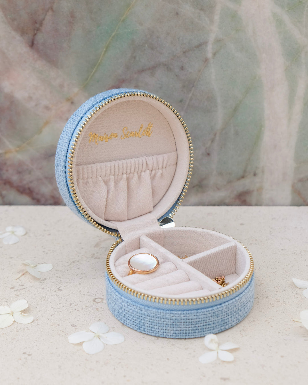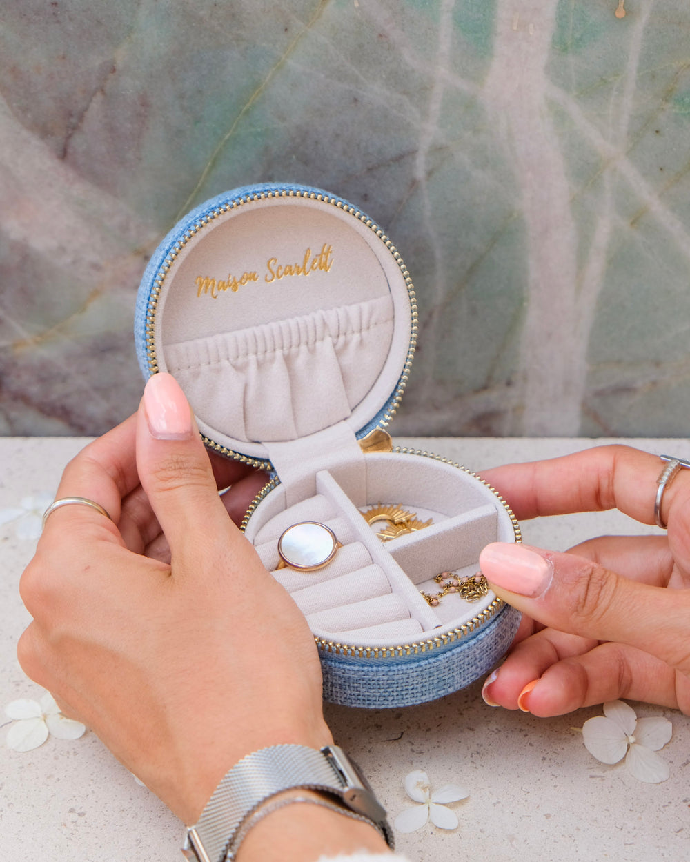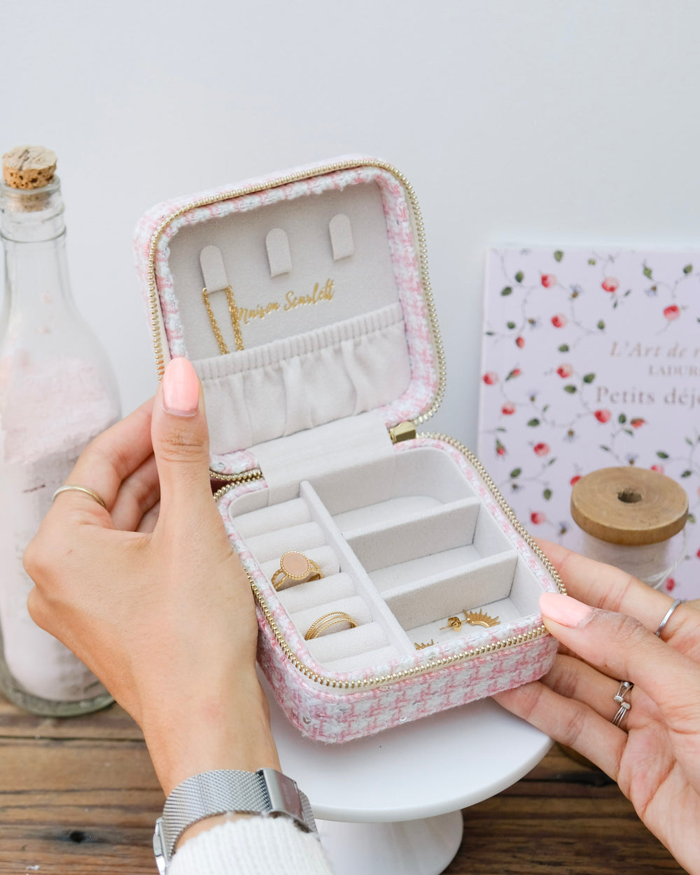 - Modèles de voyage : Parce que vos bijoux méritent le meilleur, même en déplacement, Maison Scarlett propose également des boîtes à bijoux de voyage compactes et élégantes. Légères et parfaitement compartimentées, elles protègent vos bijoux lors de vos week-ends ou longs séjours, tout en glissant facilement dans une valise ou un sac à main. Et pour encore plus de légèreté, nos pochettes à bijoux sont une alternative souple et discrète, idéale pour emporter quelques pièces en toute simplicité.