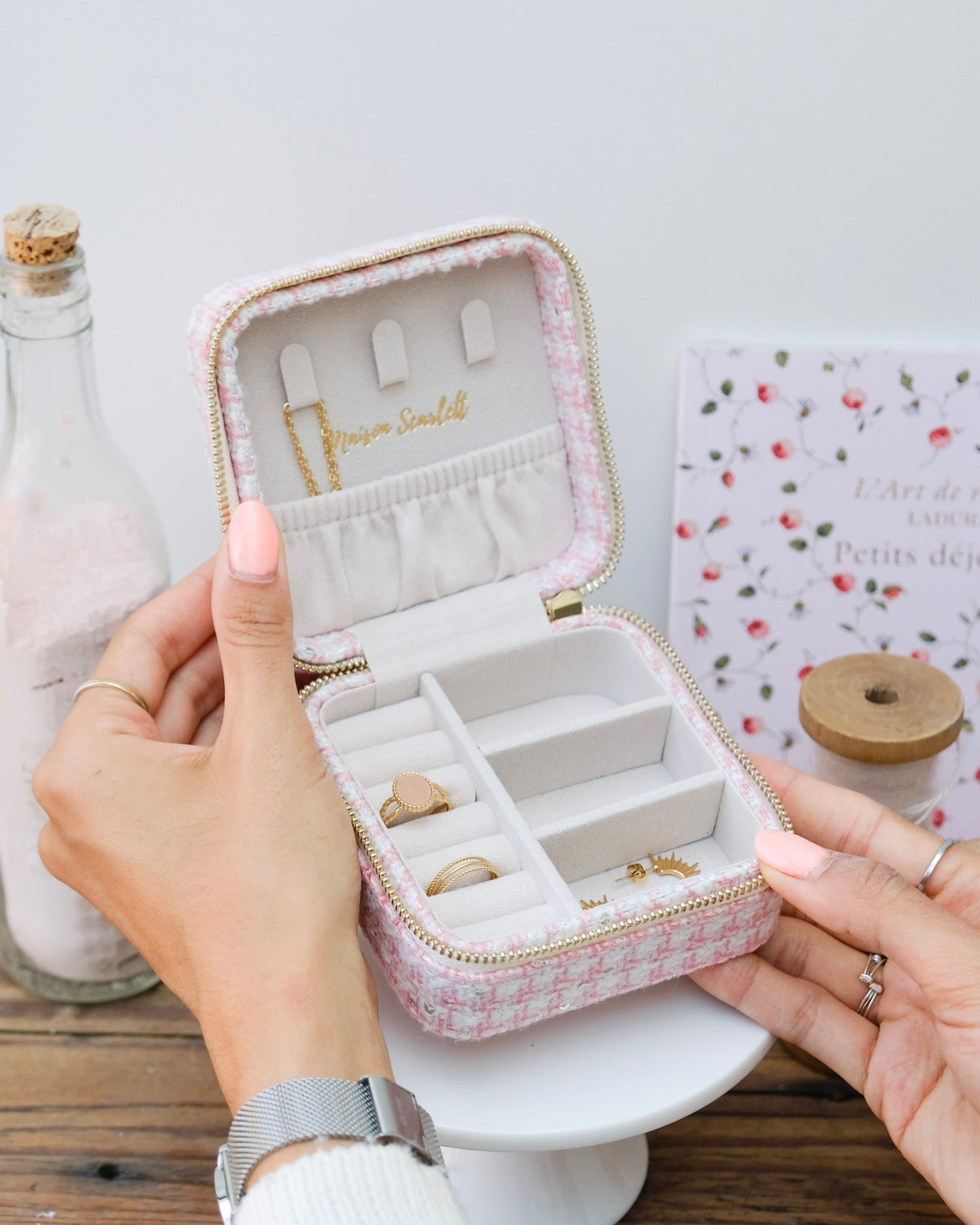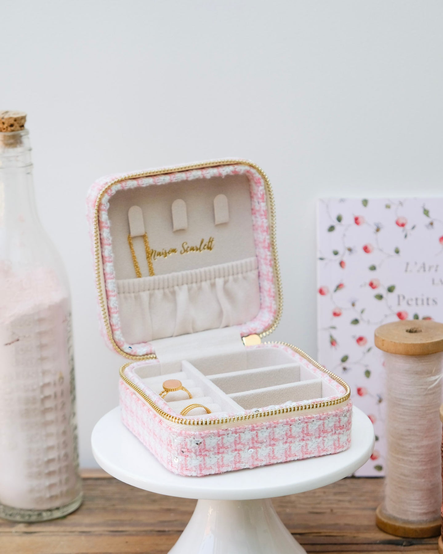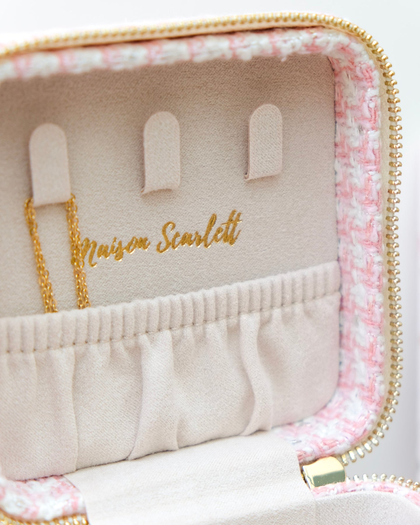 Nous avons porté une attention particulière aux détails et à la qualité des finitions lors de la conception de cette collection de boîtes à bijoux de voyage. Ainsi vous retrouverez comme sur toutes nos boîtes à bijoux la signature Maison Scarlett avec le logo embossé à chaud à l’intérieur du couvercle ainsi que la gravure sur le zip doré pour encore plus de raffinement.