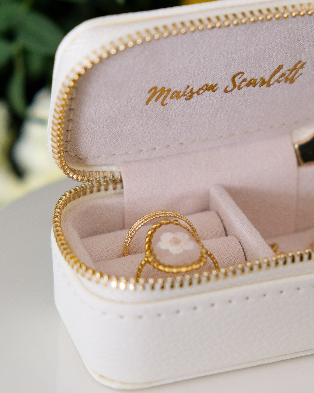 Nous avons porté une attention particulière aux détails et à la qualité des finitions lors de la conception de cette collection de boîtes à bijoux de voyage. Ainsi vous retrouverez comme sur toutes nos boîtes à bijoux la signature Maison Scarlett avec le logo embossé à chaud à l’intérieur du couvercle ainsi que la gravure sur le zip doré pour encore plus de raffinement.