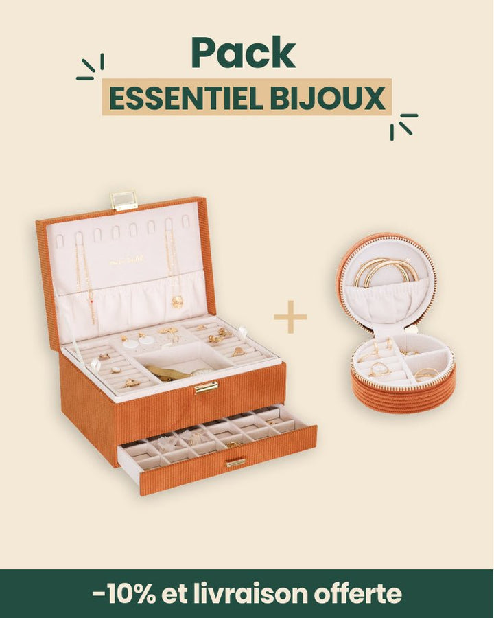Das Pack Essentiel Bijoux vereint zwei unverzichtbare Begleiter für Ihren Alltag: eine große, elegante Schmuckschatulle für zu Hause und ihre Komplizin, eine ultrapraktische Reiseschatulle für alle Ihre Reisen.