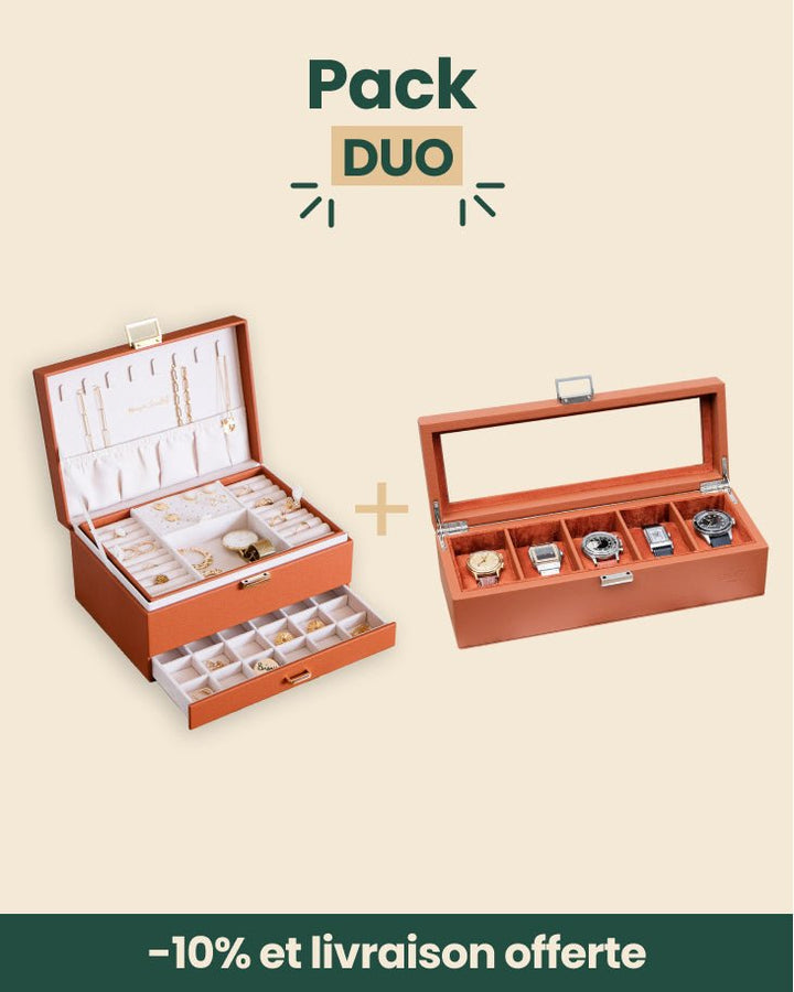 Das Duo-Pack vereint zwei Essentials, die Sie täglich begleiten: eine große Schmuckschatulle für sie und eine Uhrenschatulle für ihn, die sich perfekt zum Aufbewahren und Organisieren von Schmuck und Uhren eignen.