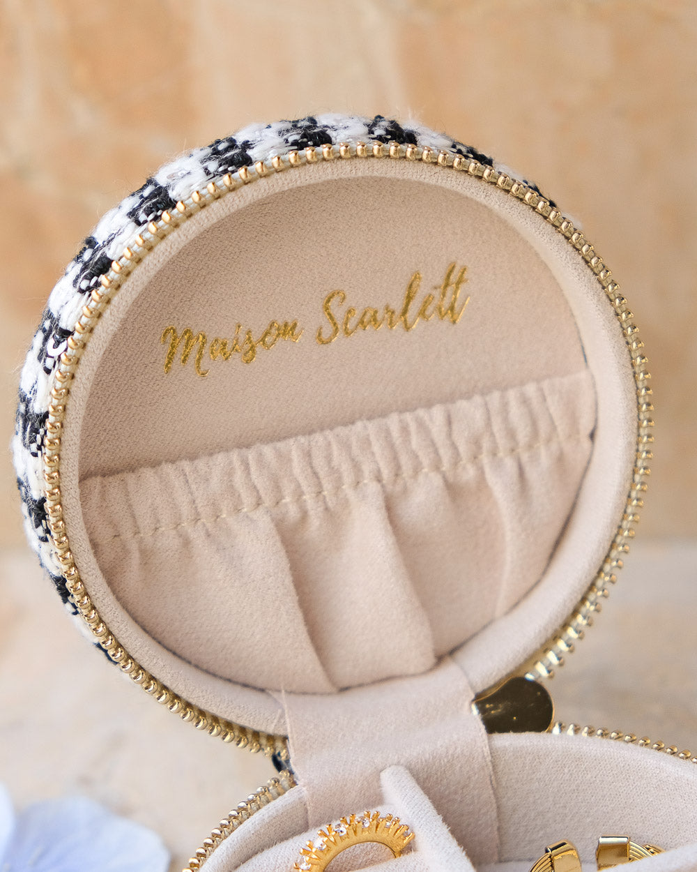 Yvonne in houndstooth is the ideal travel jewelry box and will undoubtedly become the ally of all your adventures! It is a small format very functional for your daily activities. It is cute, compact and fits just as well in a handbag as in a suitcase.