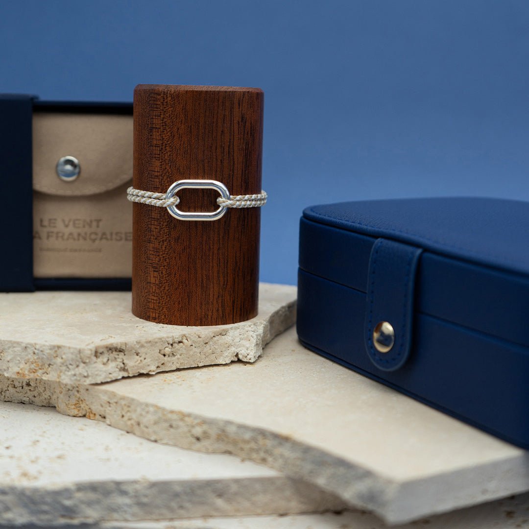 présentoir avec bracelet Le Vent à l Française et boite à bijou Maison Scarlett bleu marine en cuir